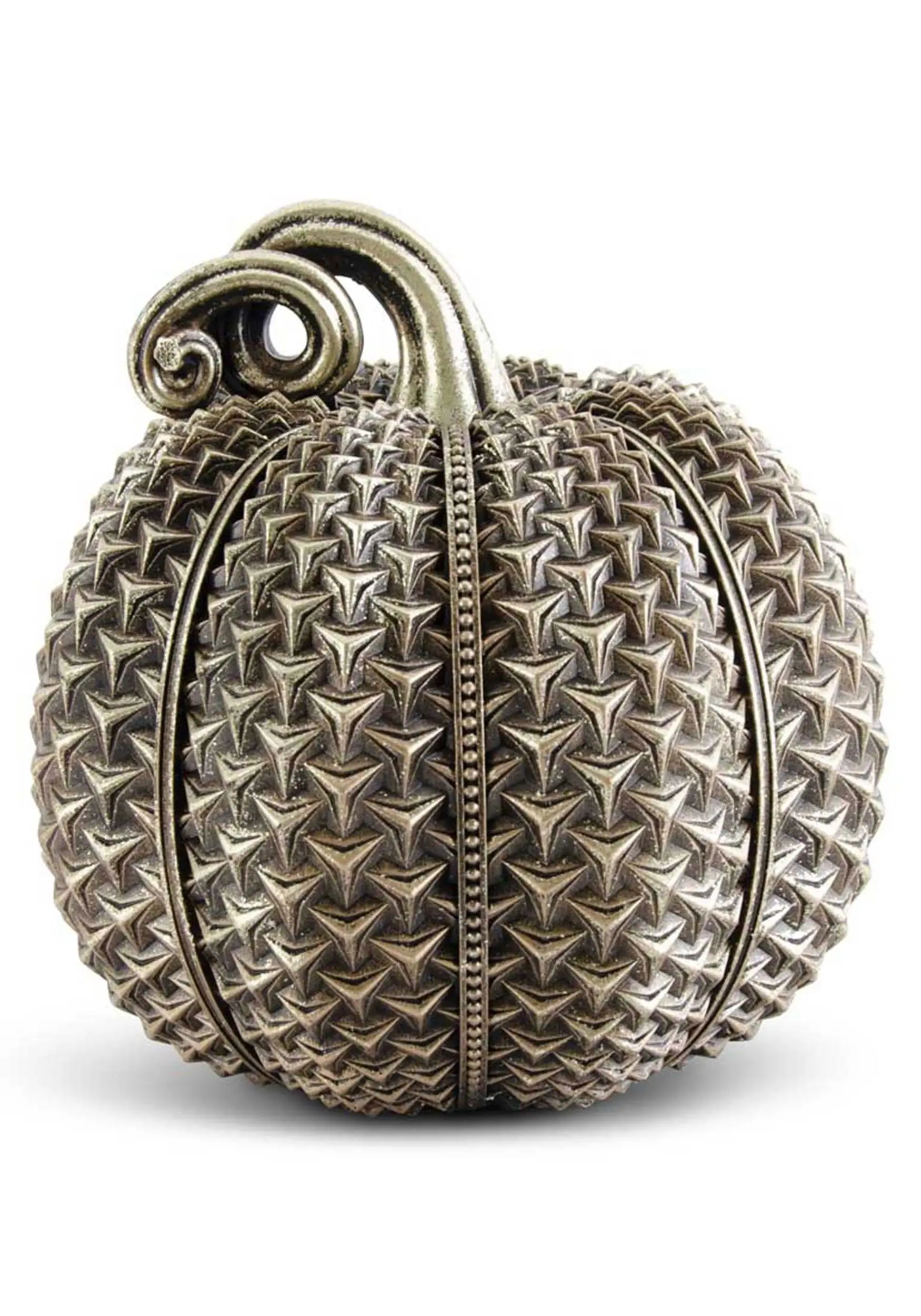 This is a 11.5″ Antique Gold Raised Arrow Textured Resin Pumpkin.