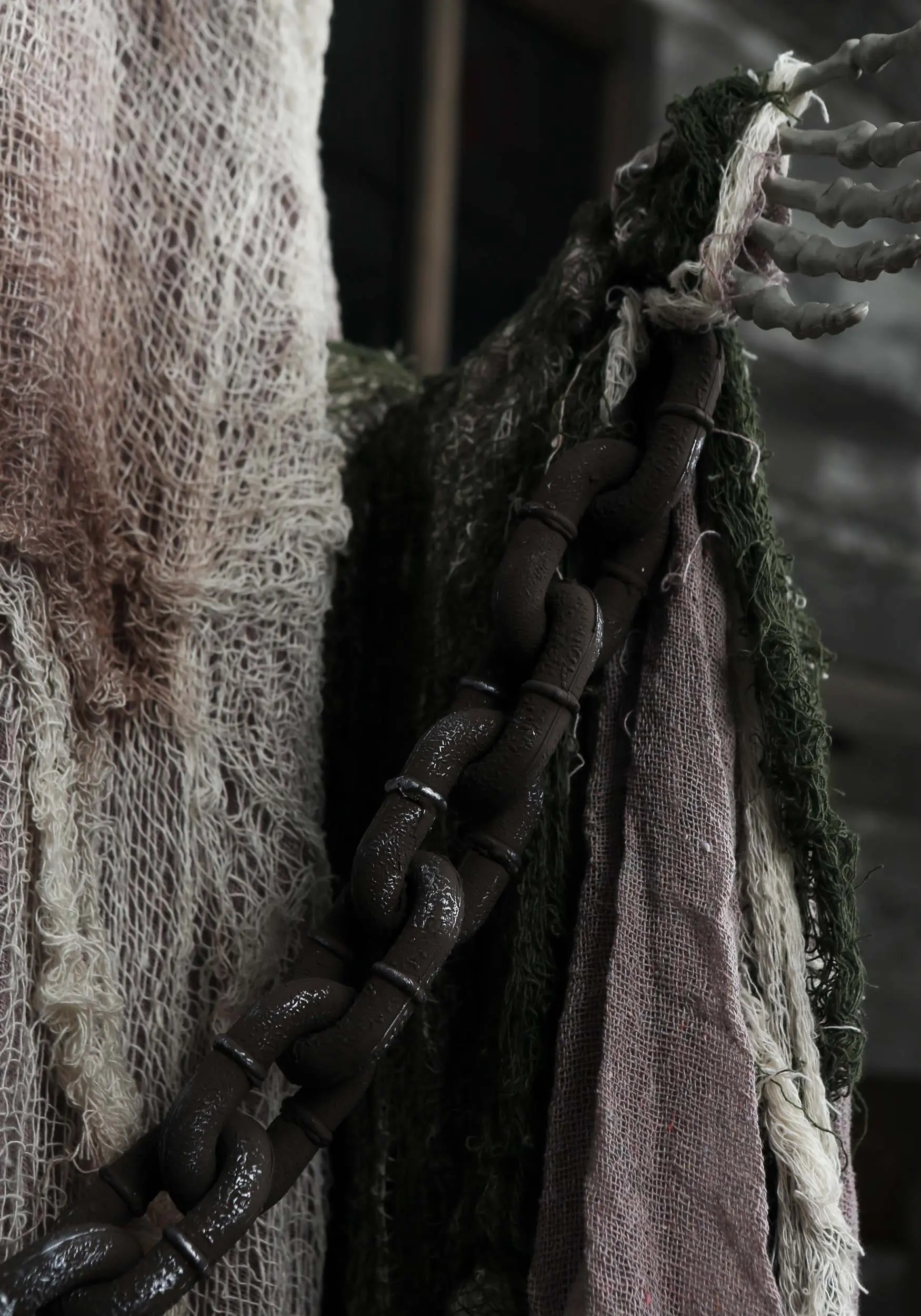- Skull & arms are draped w/ light gray and cream gauze & netting