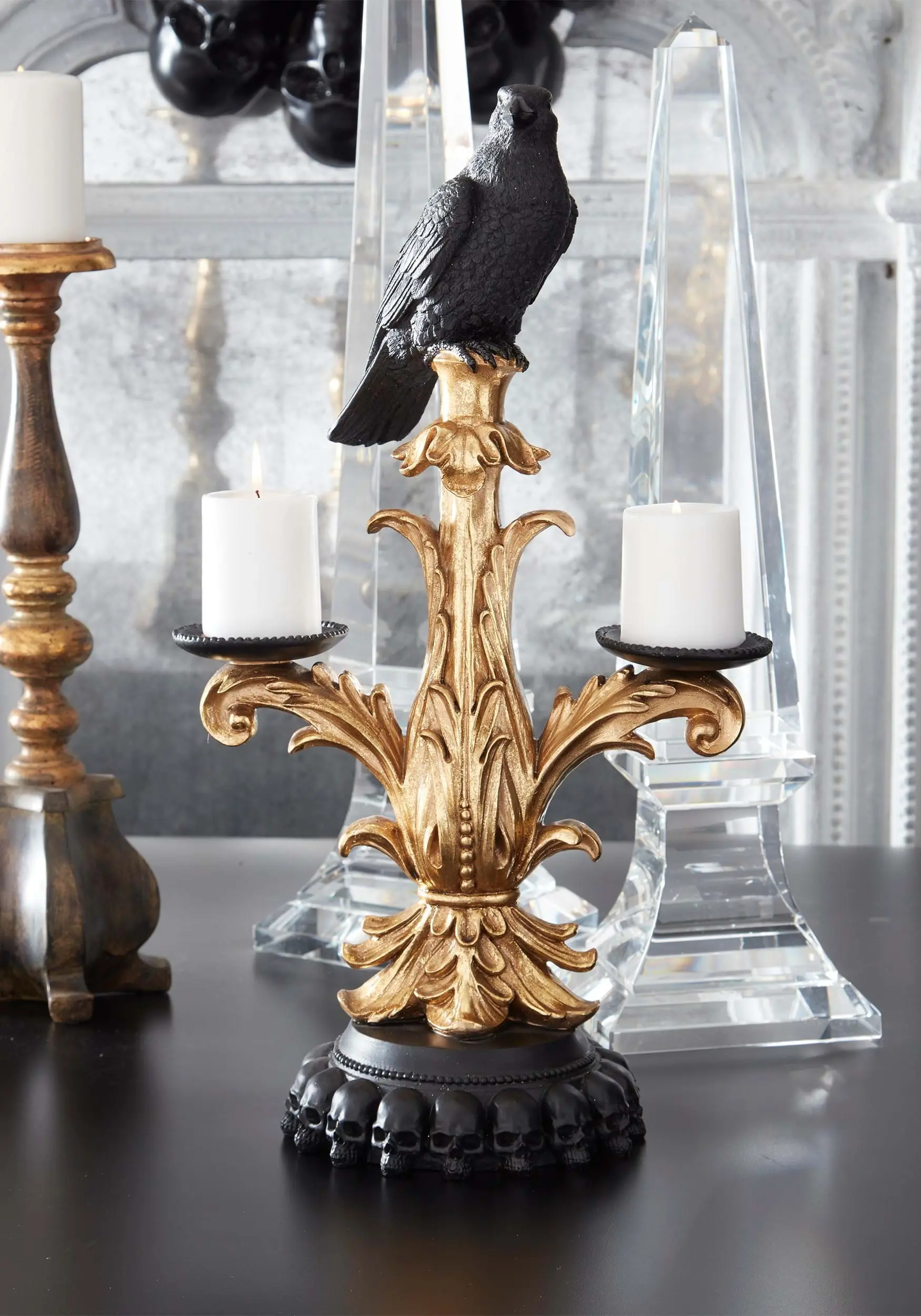 Gold And Black 21 Inch Resin Halloween Candelabra With Black Crow