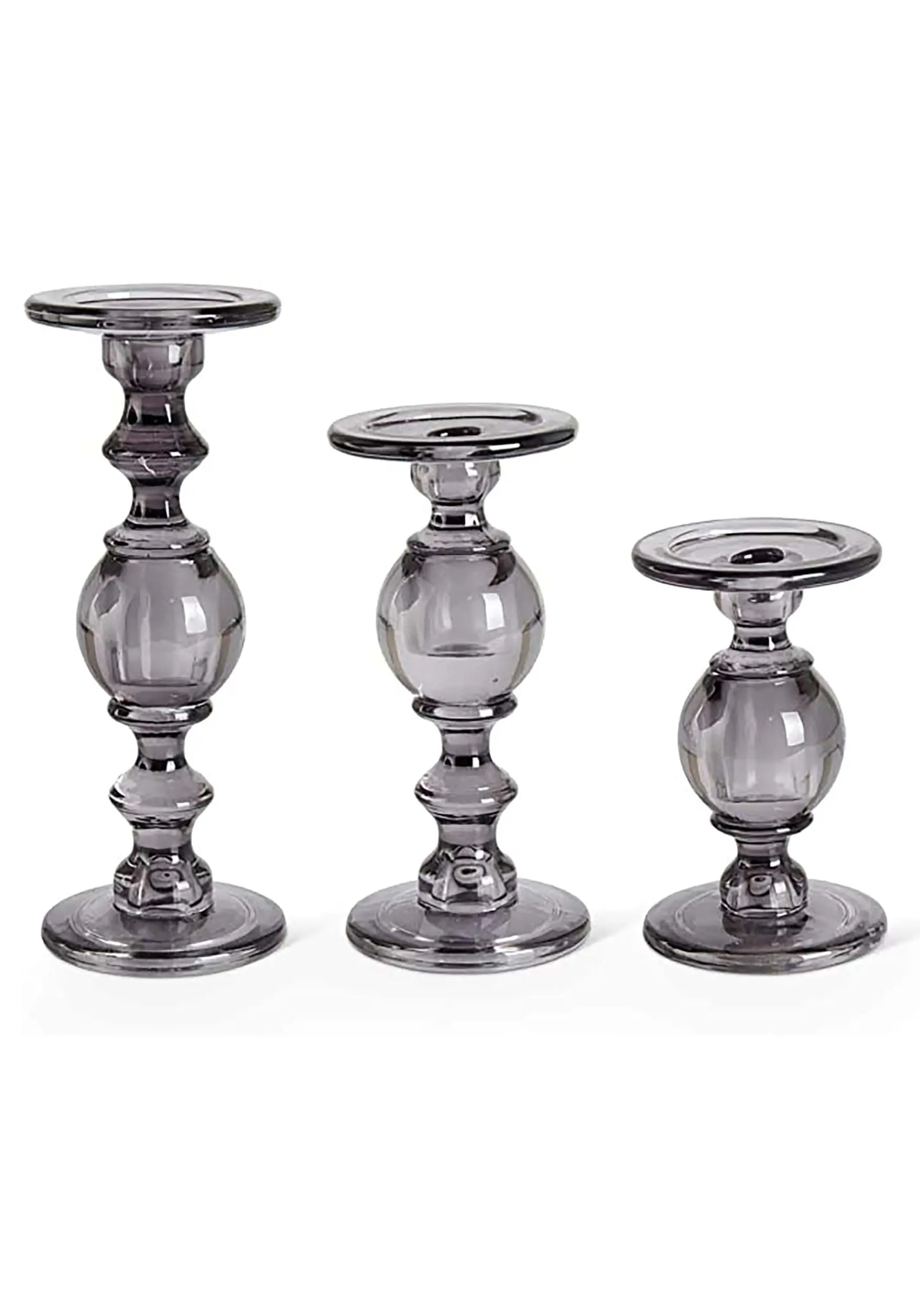 These are a Set of Three Gray Transparent Glass Candleholders.