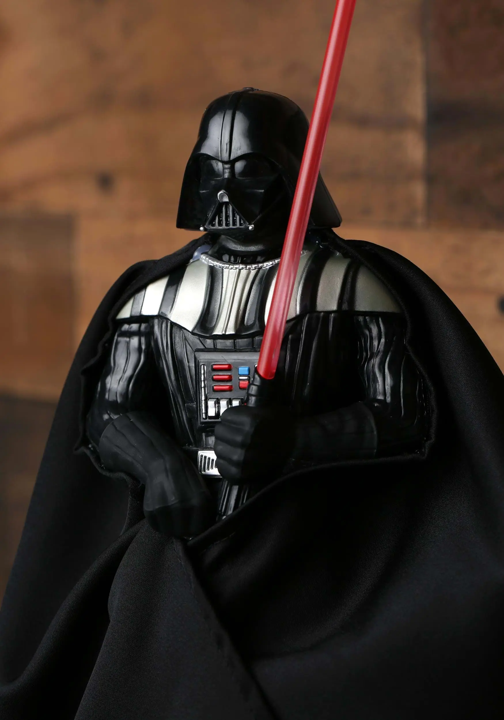 - Lightsaber lights up; battery pack located in hem of cape